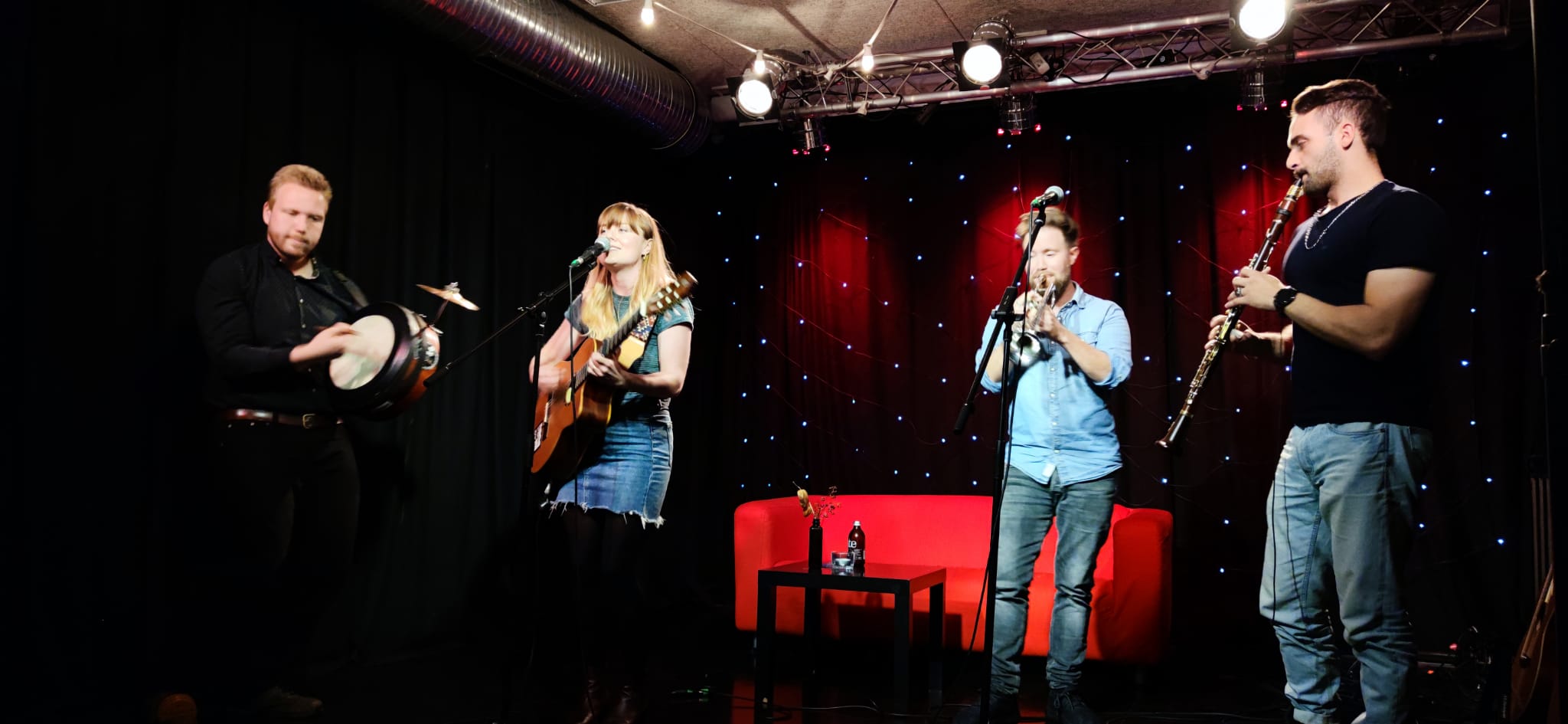 Gitarre, Klarinette, Trompete, Bodhrán, Gesang